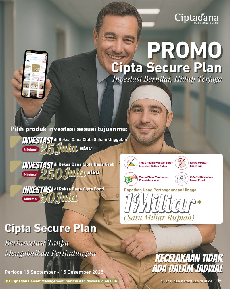 Ciptadana Asset Management dengan bangga mempersembahkan Cipta Secure Plan, merupakan program investasi bernilai yang memberikan perlindungan asuransi Personal Accident selama 1 tahun hingga Rp 1 Miliar.
